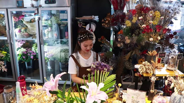 南京市湖西街加油站一楼落地窗内,摆满了清新淡雅、错落有致的插花。坐在花束中安静插花的,是一位来自云南的白族女子。这块梦幻一般映着花色的玻璃窗,与加油站严肃、单调的风格却并没有格格不入,相反,它的存在,恰恰成为了这个加油站一道美丽、独特的风景线。