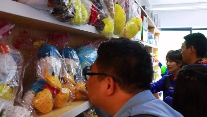 二楼两百余平米的商城展区,映入眼中的是花花绿绿各不相同的商品。以“汽车生活馆”为主题的门店分为童趣、品茗、百货等七个区域,商品不算多,从玻璃柜里各式各样的玩具公仔,到陈列柜里实用简洁的水杯、电筒与包箱,件件精致而独特。