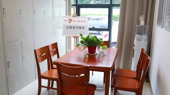 中国石化江苏石油公司总经理许卫东表示,驿站就是加油站里的“家油站”,欢迎环卫工人来加油站歇歇脚。今后还将根据条件陆续推出,补充和完善环卫职工工间休息场所,履行中国石化的社会责任。