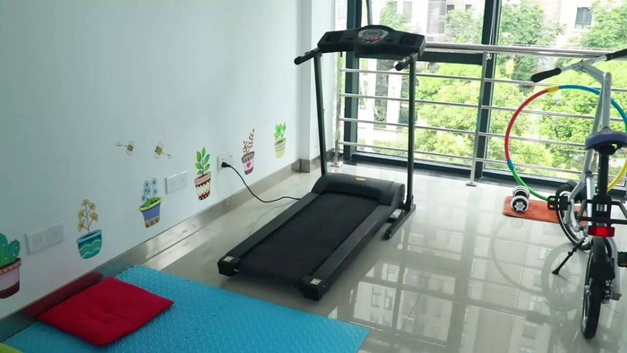 休息室供员工们午休、看书,暖黄色的灯光配上深红色窗帘,整个屋子显得朦胧而温馨。而活动室内的跑步机和瑜伽垫,则满足了员工们工作休息之余放松身心的需要。