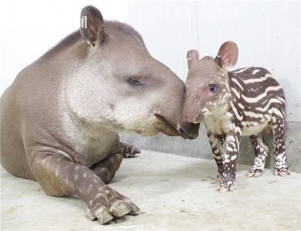 5月26日清晨4点半,经历十一个半月的漫长孕期,南美貘“花花”顺利产下男宝一枚,爸爸叫“朵朵”,所以宝宝借用爸妈的名字起名为“花朵”。早上6点多,“花朵”顺利地吃上了初乳,持续20多分钟。妈妈“花花”母性很强,有陌生人接近就特别谨慎,永远不会让“花朵”走出自己的视线,晚上睡觉的时候,也会把宝宝藏起来。每次把“花朵”喂饱以后,就会把宝宝身上的脏东西舔干净,然后安静地陪宝宝。