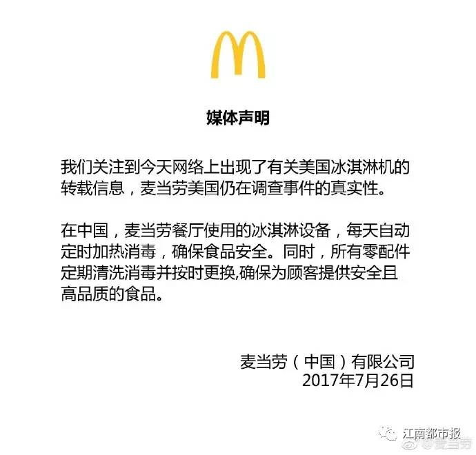 昨天深夜11点,麦当劳官方微博发布声明称,在中国,麦当劳餐厅使用的冰淇淋设备,每天自动定时加热消毒,所有零配件定期清洗消毒并按时更换。