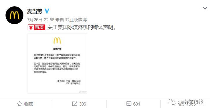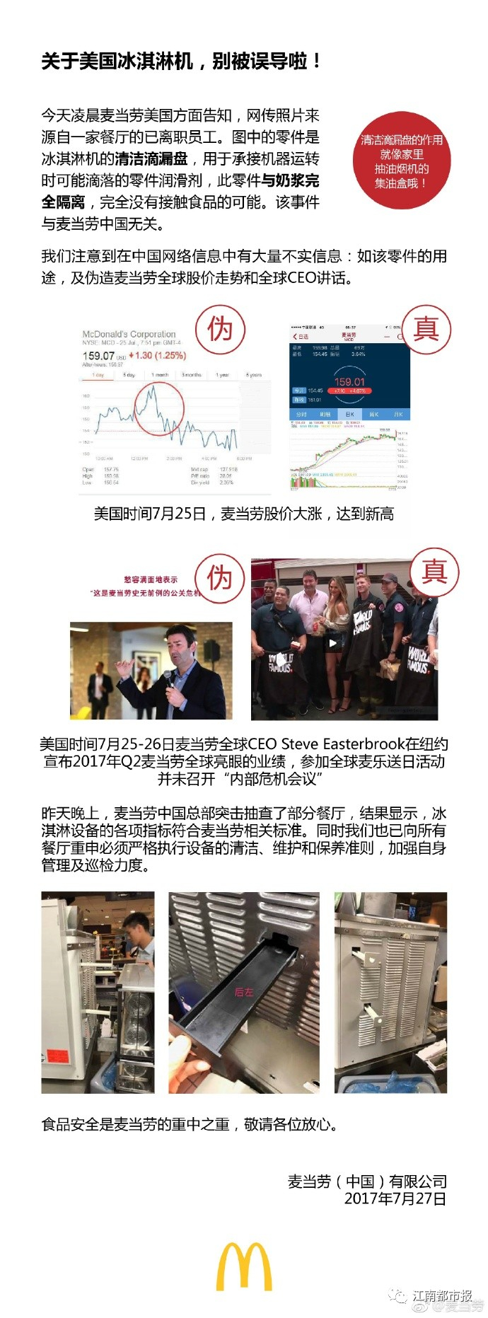 今天中午,麦当劳官方微博再次发布声明,关于美国冰淇淋机的传言,他们还有些话想说…