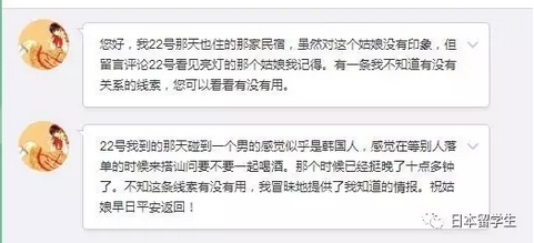 此外也有网友积极提供线索,与危秋洁同住一个民宿的网友表示曾在附近遇到向落单女孩搭讪的韩国人。