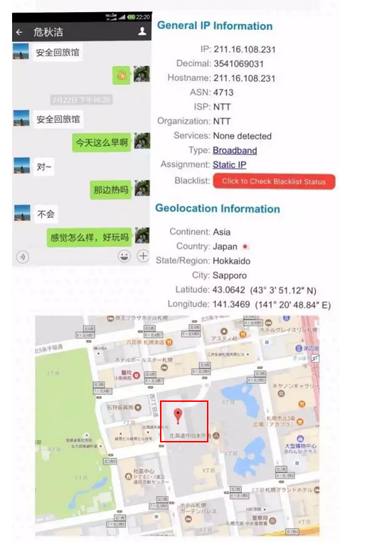7月22日 酒店监控显示她7点多独自一人离开酒店(计划去旭川玩富良野看熏衣草),还回复了微博评论留言。傍晚和爸爸微信联系之后,再也没有任何消息。酒店前台发现她彻夜未归,23号查房也没发现她回来过,酒店老板直接向当地警察局报警。查到微博22日最后登陆IP等相关信息,以及根据经纬度定位到地址。