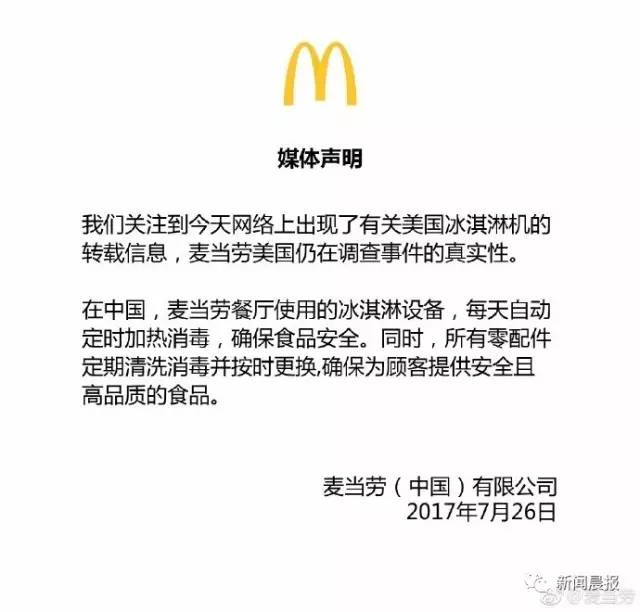 昨天深夜11点,麦当劳官方微博发布声明称,在中国,麦当劳餐厅使用的冰淇淋设备,每天自动定时加热消毒,所有零配件定期清洗消毒并按时更换。