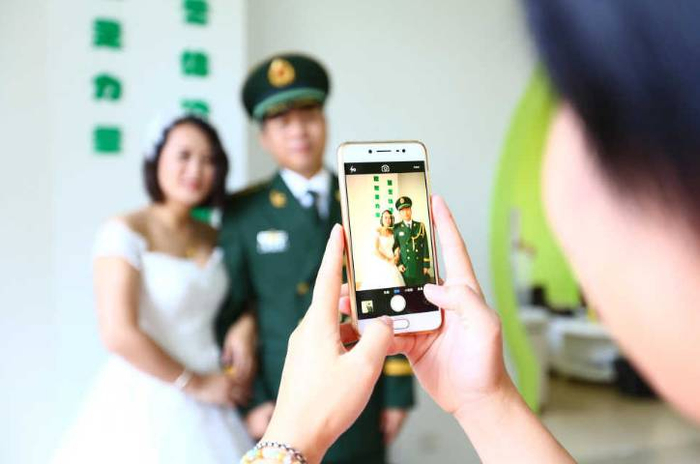 战友们一同见证新人的幸福时刻。王弘晢摄影