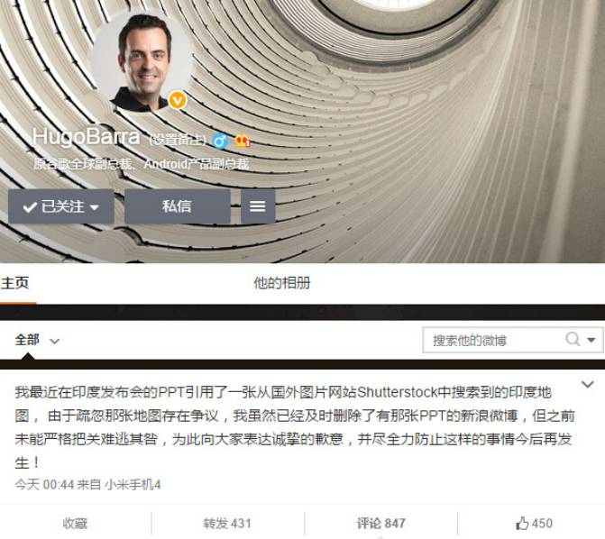 2015年,时任小米全球副总裁的雨果·巴拉在印度新机发布会上展示的中国地图将阿克赛钦与藏南地区统统“划给”了印度。在印度发布新机,地图上的错误正好是中印存在争议的地区,这令网友十分气愤。