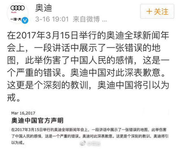 之后,奥迪中国官方针对“地图门”发布了86字的道歉,称“这更是个深刻的教训,奥迪将引以为戒”。但这则由奥迪中国而不是总部发出的简短的道歉声明,并没有平息网友的愤怒。
