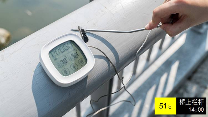 公园里常见的小桥流水,桥上的栏杆这时候也是潜在的“雷区”。周到君接触栏杆短短几秒钟,就感受到被烫得痛了。