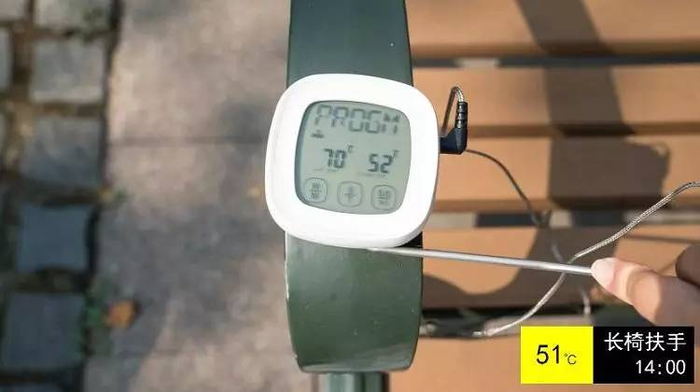 公园的长椅长时间暴晒在阳光下,总维持在比较高的温度。木质的椅面温度甚至高过金属扶手。