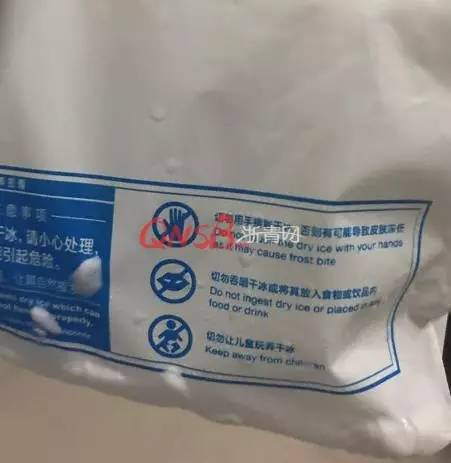 发现异常的王女士赶紧停下动作,拿起冰袋仔细一看,才发现背面写着注意事项有“干冰,请小心处理,能引起危险”的字眼。还有一行提醒“切勿用手接触干冰,否则有可能导致皮肤冻伤。”