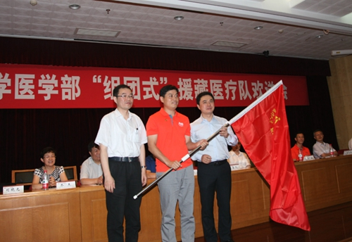 授旗仪式北京大学各附属医院第三批援藏医疗队员将继续发扬北医人的“厚道”精神,发挥“主力军”和“先锋队”的作用,以坚定不移、携手同心、科学管理、睿智务实的实际举措,因地制宜、循序渐进地稳步实施和扎实推进各项工作,逐步推动北大医学医疗人才“组团式”援藏工作向纵深发展,为保障西藏广大人民群众身体健康、提高西藏医疗卫生水平做出新的更大的贡献,让北大医学的旗帜在雪域高原上继续飘扬!(文/韩娜 摄/郭赛亮)