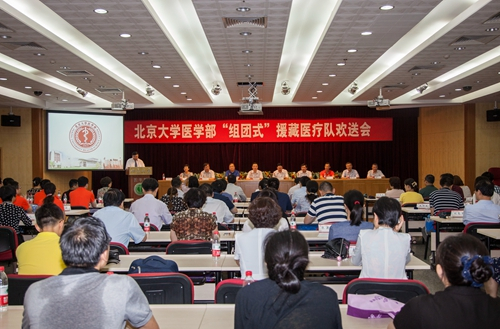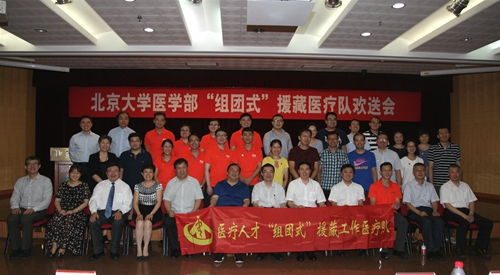 响应号召,走向边疆;无私奉献,不忘初心;一年援藏行,一生援藏情。2017年7月26日上午,北京大学医学部第三批“组团式”援藏医疗队员欢送会在逸夫楼209报告厅召开。国家卫生计生委医政医管局局长张宗久、巡视员李路平、行风建设处处长陈虎,医学部党委书记刘玉村、副主任肖渊,北大医院院长刘新民、党委书记潘义生,人民医院党委书记赵越,北医三院院长乔杰、党委书记金昌晓等国家卫计委领导、医学部领导、各医院党政领导、援藏医生及家属、科室领导、工会负责人以及新闻媒体等100余人参加会议。会议由医学部副主任刘晓光主持。