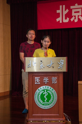 姚树坤发言第三医院消化科副主任医师李军夫妇代表援藏队员及家属发言。李军感谢医学部和三院的后方支持,表示将利用自己的知识和技术,帮助藏族同胞解决病痛,同时做好“传帮带”的工作,把三院人规范的医疗、严谨的态度、高度的责任感带到西藏,把北医“勤奋、严谨、求实、创新”的精神带到西藏,让北大医学的名字在西藏更加响亮。李军的丈夫于涛也是第三医院的一名医生,他非常支持妻子的援藏工作,表示将全力照顾好双方的父母和孩子,照顾好家庭事务,让妻子没有后顾之忧,能够成功完成任务。