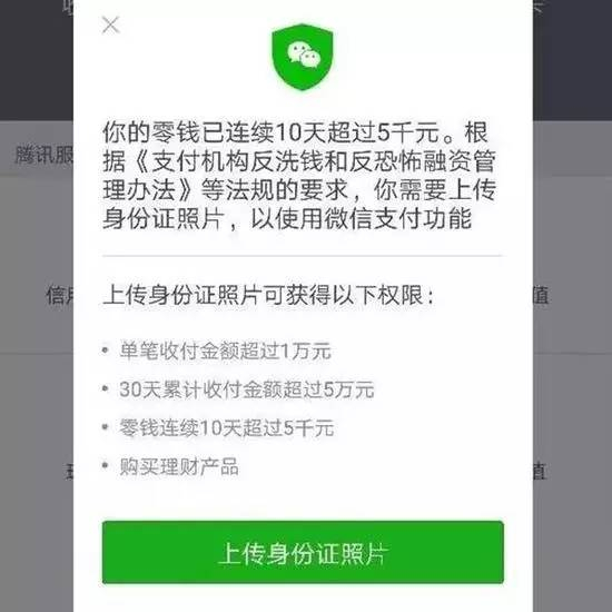 “你的零钱已连续10天超过5000元。根据《支付机构反洗钱和反恐怖融资管理办法》等法规的要求,你需要上传身份证照片,以使用微信支付功能。“