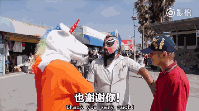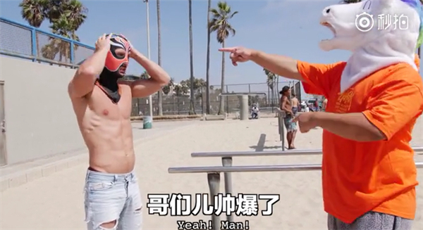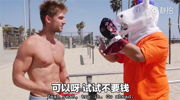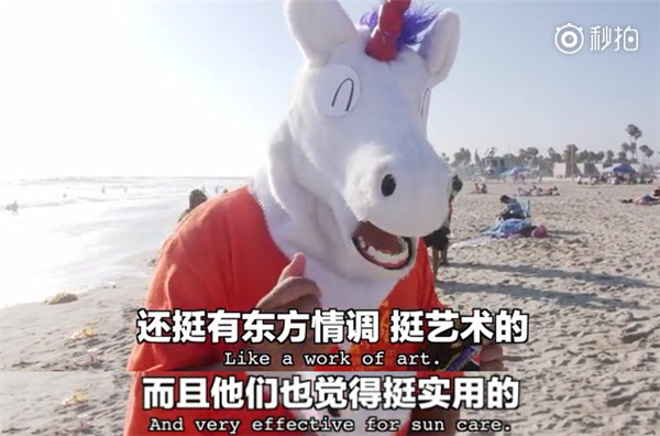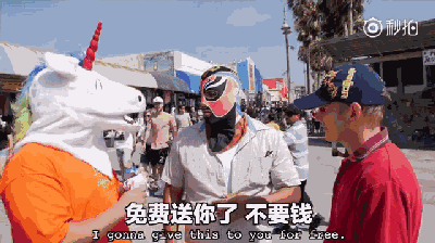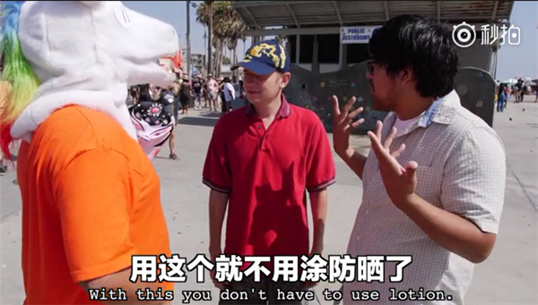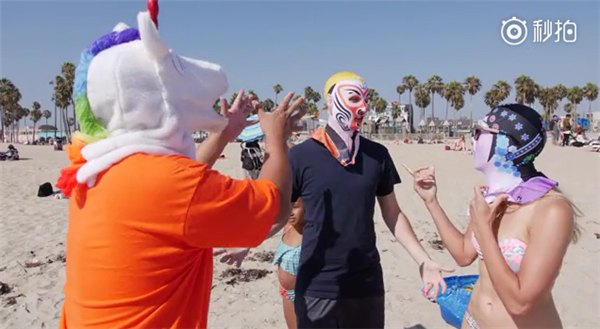 主持人还送了个脸基尼给在海滩买雪糕的墨西哥大叔,大叔戴上之后,生意更好了……
