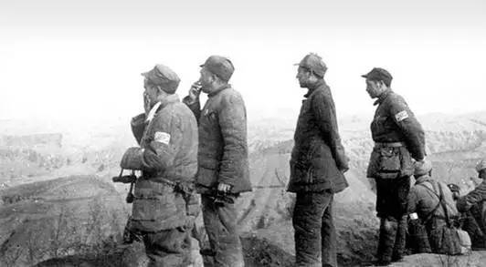彭德怀(左二)、习仲勋(左三)等在青化砭战场上