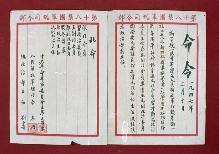 1937年全国抗战爆发后,国共合作,红军主力被编为国民革命军第八路军,南方的红军和游击队被改编为新编国民革命军第四军,简称八路军和新四军。1946年6月,全面内战爆发,解放日报在9月12日《蒋军必败》的社论中,首次正式使用了“人民解放军”的称谓。次年2月,新四军的番号正式停止使用。你面前的这份“命令”,就发出于当月。