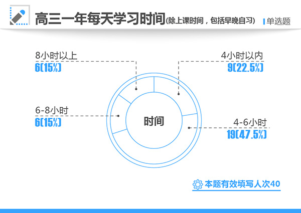从调查问卷来看,高三每天(除上课时间,包括早晚自习)学习4小时以内的状元共9人,近五成的状元每天学习在4-6小时之间。同时,仍有6人表示自己高三课余学习时间超过了8小时。