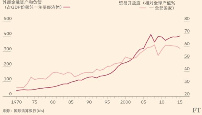 贸易以及金融资产和负债相对于全球产值的快速增长,在金融危机之后停滞。