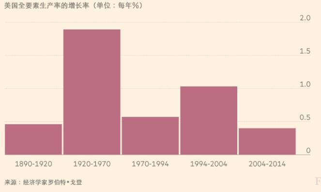 经济学家罗伯特•戈登称,自1970年以来,美国再没有能赶上1920年至1970年间的生产率表现——如“全要素生产率”(total factor productivity)的增速所示。