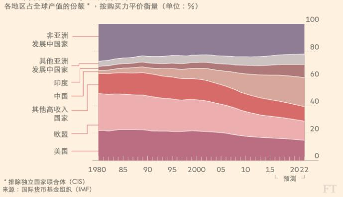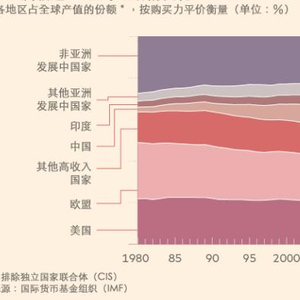 国际货币基金组织(IMF)预计,按购买力平价计算,从1990年到2022年,高收入国家占世界产值的份额从64%下降至区区39%的水平。引人注目的是,新兴和发展中国家份额的上升完全是亚洲新兴和发展中国家贡献的:因此,预计同期亚洲新兴和发展中国家占世界产值的份额将从12%升至39%。