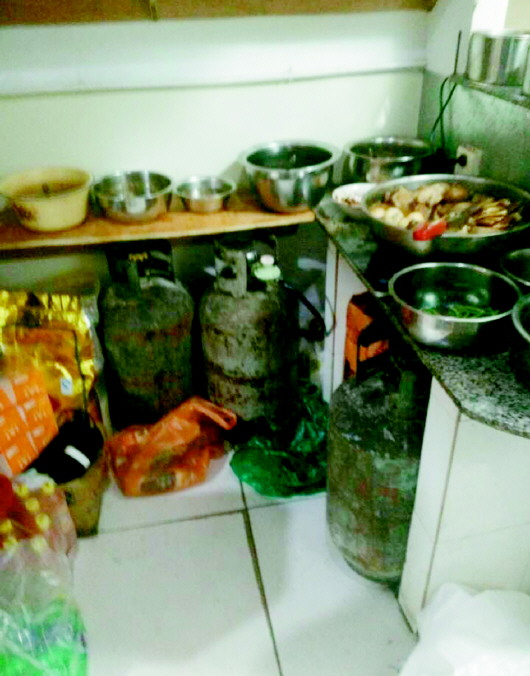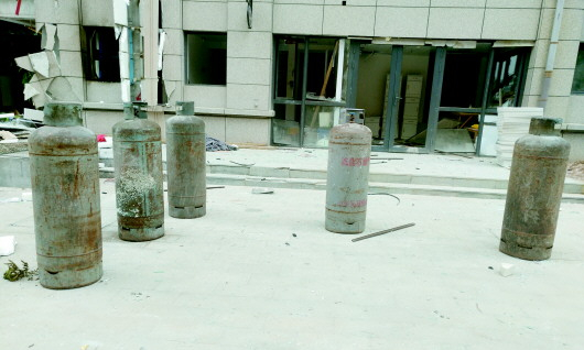 ◥文化东路一处一楼餐饮店内,有7个液化气罐,照片中为其中3个。 本报记者 王皇 实习生 王佳佳 摄