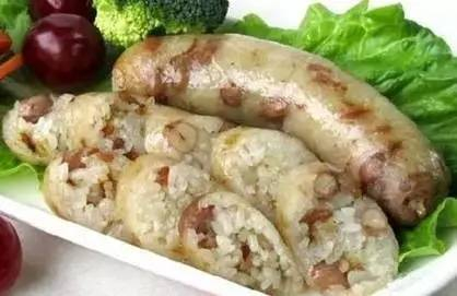 取猪大肠的中段洗净,将糯米浸软,然后和猪肉香菇虾莲子等辅料混在一起加入调味料,最后“胀”进洗干净的猪大肠里。“胀”好的猪大肠放进锅里烹煮一个小时左右就可以捞起来切片蘸酱油食用。