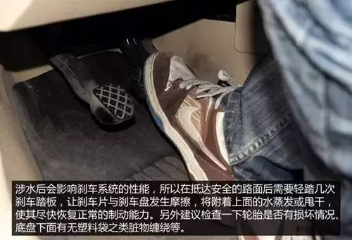 涉水后不能一走了之,在抵达安全的路面后要对车辆进行一个简单的检查。因为刹车系统在过水之后刹车性能会受到影响,所以出了积水路面后,车辆仍应低速行驶一段路程,并轻踏几次刹车踏板,让刹车片与刹车盘发生摩擦,将附着上面的水蒸发或甩干,使其尽快恢复正常的制动能力。