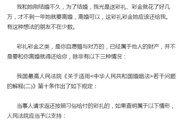 只要不符合以上3条,包括什么结婚钻戒啊,给付的现金彩礼啊,结婚购买的衣服啊之类的,都统统要不回来。(所以啊,结婚了,把身体养好,多干点活吧。)