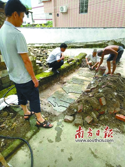 日前,沈荣海将埋藏在自家屋外地坪下的“广州会馆”牌匾挖掘出来。 |