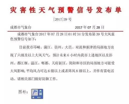成都市气象台2017年07月28日01时34分发布第39号大风蓝色预警信号。