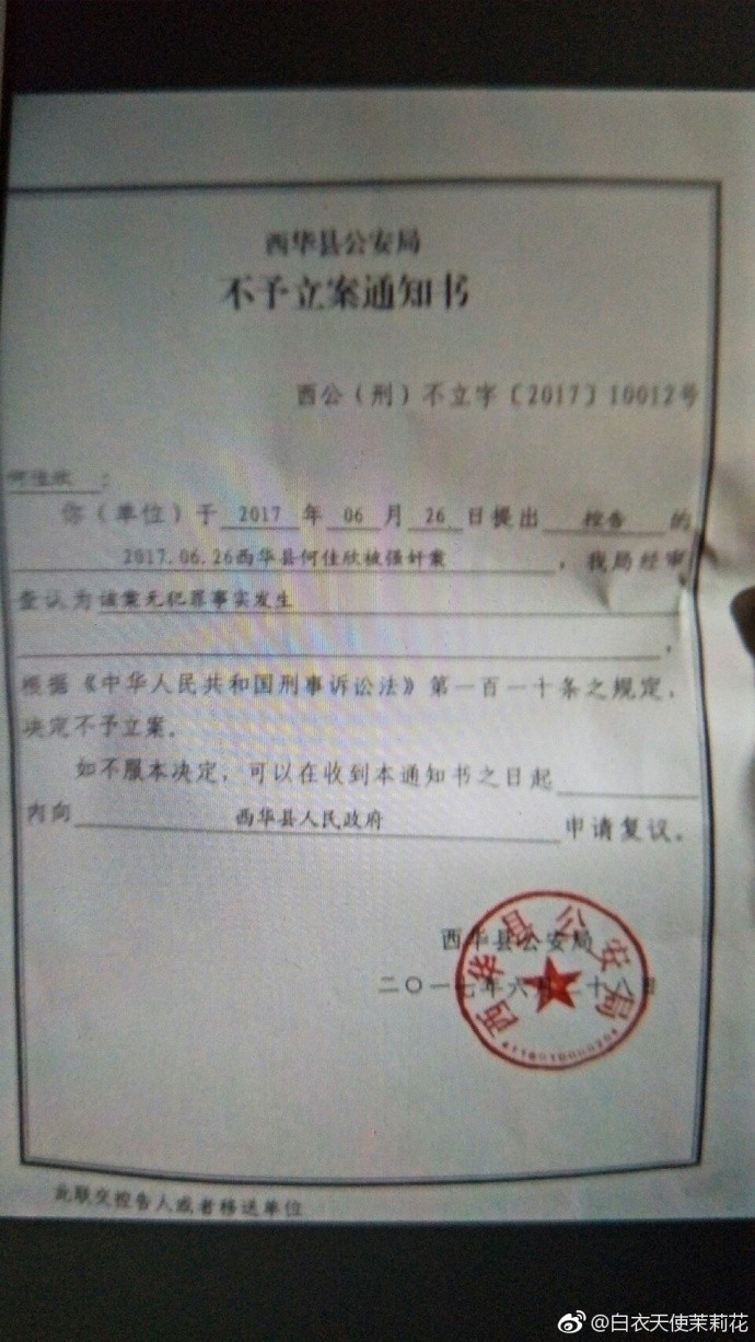 西华县公安局不予立案通知书 图片来源:@白衣天使茉莉花