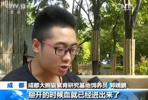 成都大熊猫繁育研究基地饲养员 郭靖鹏:抱它的时候,刚刚触碰到它的后背,它就很警惕地转过身来就把我的手搭住,在我手臂的位置啃了两口,我感到特别地疼,就把它的嘴巴掰开,掰开的时候血就已经迸出来了,当时都见到白色的东西,不知道是肌腱还是骨头。