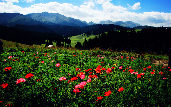 每年六到九月,是最美的时候,党参花、野蔷薇、野菊花等各种野花开遍山岗,形成天然的花地毯,将绚丽多姿尽情的展现在你的眼前,一切显露的如此壮观。北望,万亩麦田壮美如云,军垦新居星罗棋布;南观,天山雪山耸立,远眺巍峨的雪山牵着空中的白云;畅步在蔚蓝的苍穹,不亦乐乎。