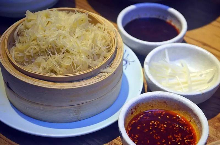 金钱油塔像小山一样堆在小蒸笼里丝丝盘绕,用筷子提起塔尖抖一抖放到自己的碗里,配上辣酱或大葱丝,松软绵润,清爽利口。