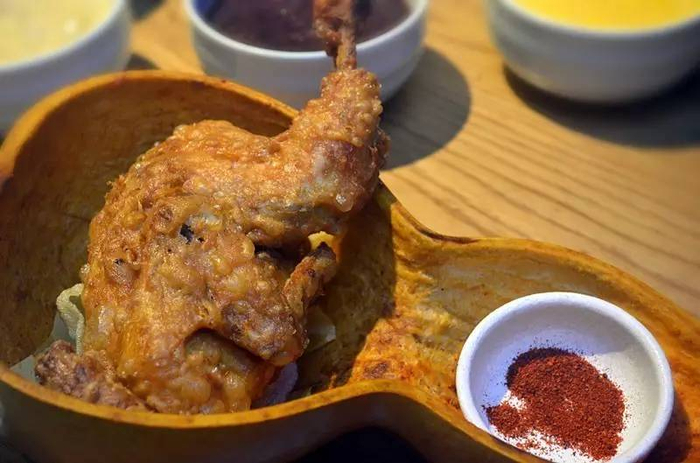 葫芦鸡是陕西独有的名菜,地道葫芦鸡,须经过煮、蒸、炸三道工序方可完成。清煮入味、笼蒸脱骨、油炸焦脆香鲜。葫芦鸡上桌,呈在面前的是金黄色脆皮,用手拿起的是筷触骨离,吃到嘴里的是皮酥肉烂,再正巧配上一辣椒味碟,焦脆醇香。