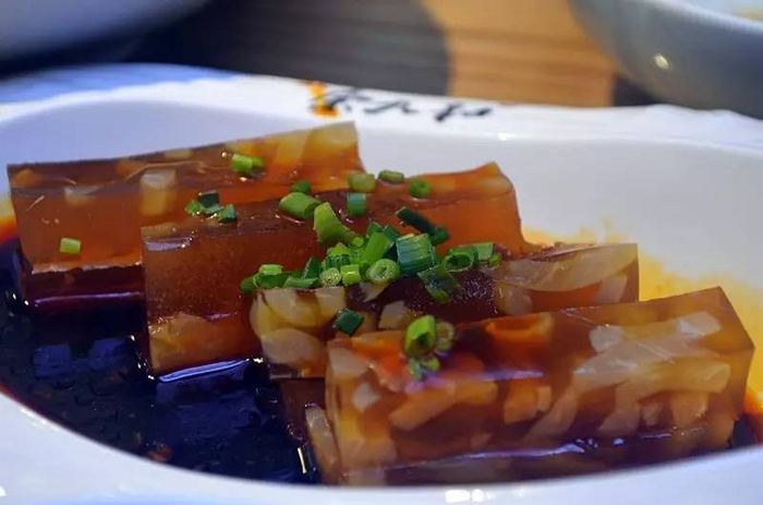 晶莹透亮的皮冻实际上是猪肉皮熬煮出来的,入口消融,感觉满口的胶原蛋白,鲜滑爽口。