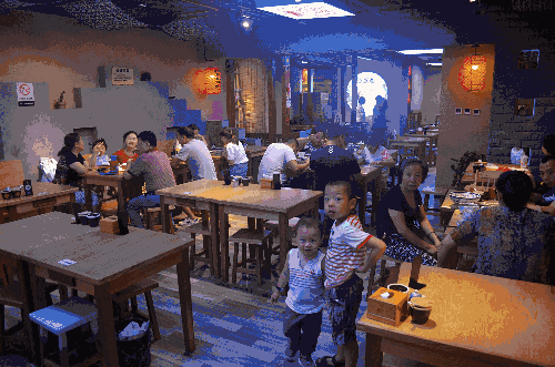 走进喜盈门·范城G层的秦九和,仿佛闯入一户陕西农家,屋檐上高挂红灯笼,暖黄色土墙似窑洞,细节处的蓝花布、剪纸年画、花脸谱......一下子将人拉入浓浓的关中风情里。在这里不光满足口腹之欢,亦能感受十足文化底蕴。