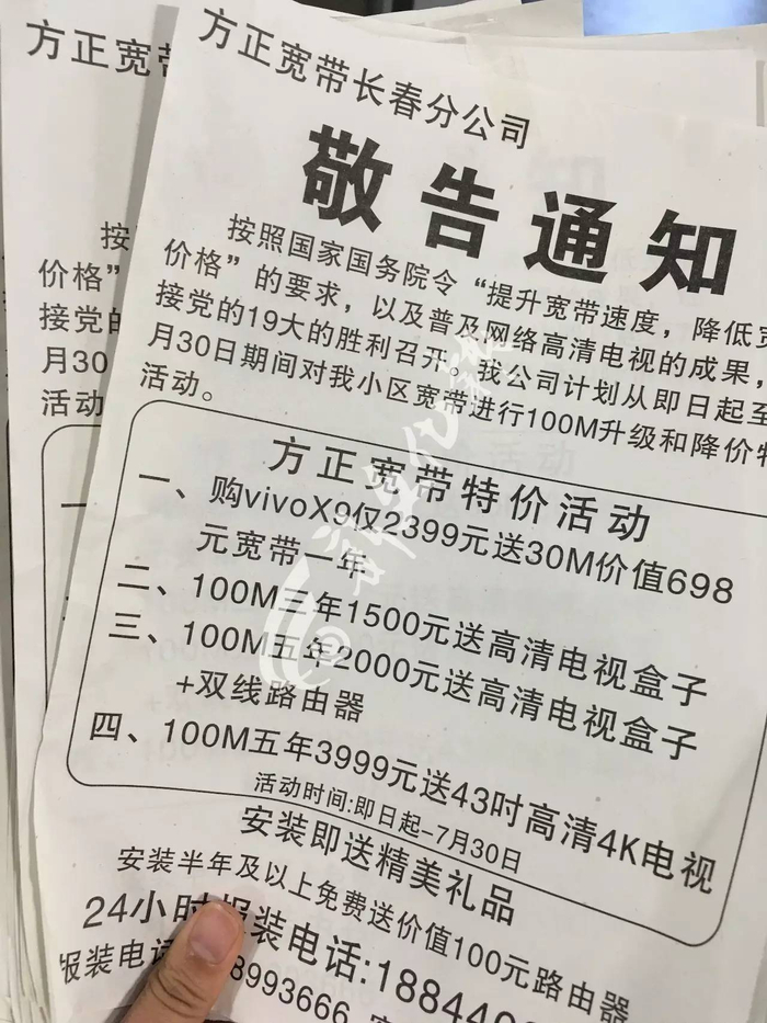 随即来到了长春市绿园区正阳西街附近,在现场负责人刘组长发给新文化记者的传单中可以看到,这种广告有A4纸大小,呈黑白色,上面有1500元、2000元、3999元的宽带套餐。