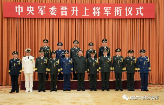 中央军委晋升上将军衔仪式今天在北京八一大楼隆重举行。中央军委主席习近平向晋升上将军衔的军官颁发命令状。