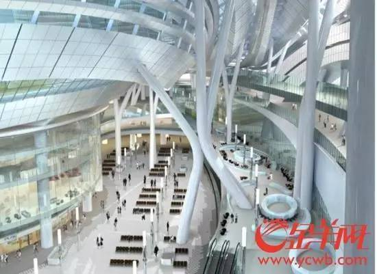 内部而言,西九龙总站天幕上盖以45米高树形支柱支撑,大大增加站内的空间感,同时令自然光线能照亮总站底层。