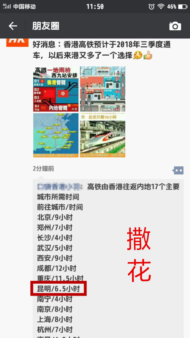 按照这条朋友圈扩散的消息,明年第三季度,昆明人就能坐着高铁去香港玩了,只要6.5小时,去个武汉这样的中部城市也差不多时间。