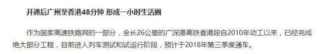 而据浙江在线报道,尚未通车的香港段(福田站至西九龙总站,全长26公里),已经完成绝大部分工程,目前进入列车测试和试运行阶段,预计于2018年第三季度通车。