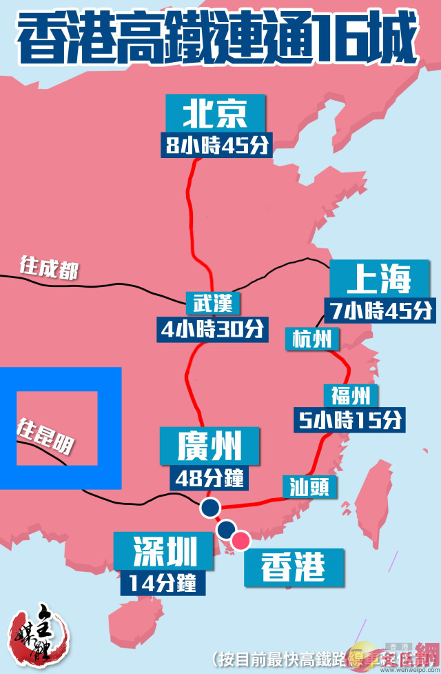对昆明人来说,可以搭乘高铁从昆明出发,经广州,到达香港。初步估算,需耗时至少7小时以上!(目前昆明至广州最少需6小时31分钟、广州至香港需48分钟)