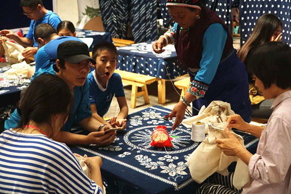 在璞真扎染体验区,白族“金花”教游客孩子扎花。姚柯凡 摄