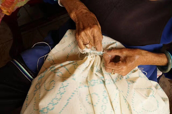 扎花其实不难,五六岁的小女孩就能习得,青年人若真要学起来,其实没什么困难,只是一个熟能生巧的过程。可如果单纯为工厂扎花并买卖零售的话,一个月只能赚一千多元。并且,扎花虽不难,工作量却很大,一副1.65x2米的扎花一般要几千针才能扎成,长期下来食指的第一个关节会无法伸直,整个食指呈现弯曲变形的状态。对于年轻人来说,这是一个十分吃力且养不活自己的营生。不少中年人也选择外出打工,可以赚更多的钱养家。前文提到的张凤良,也只是靠零售扎染补贴家用,家里真正的收入大头还是丈夫赚来的。璞真的段厂长坦言也:“赚不到钱我也不会做扎染的传承发展”。