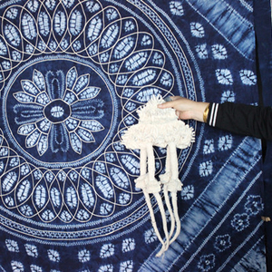 而年轻的蓝续则呈现出一些新面貌。虽然大部分扎花也是老金花在做,但本来技艺较浅的小白通过这两年的学习,也掌握了一些复杂精细的花纹。作为“95”后,白族姑娘小云本来失去了耳濡目染的扎染学习环境,来这里工作一个月后,也学会了基本的针法,可以熟练教授给顾客。另外,并不局限于传统扎染的棉麻布料,蓝续给吃不消细密针脚的丝绵布料研发出了“捆扎”的方法,这种方法也适用于真丝。似乎扎花在80、90后这一年龄中的传承断层,有弥补挽回的趋势——以年轻人自己的方式。