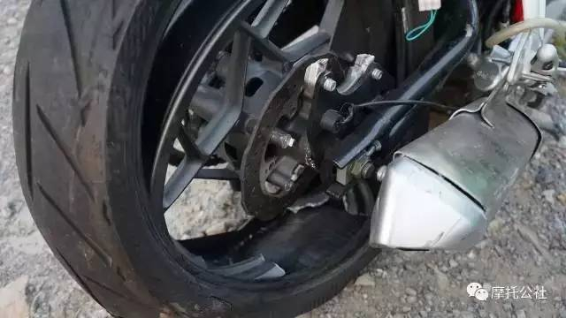 因车速较快,车子落地冲击力很大,加上尾部碰撞,所以事故车辆的后摇臂弯曲,后刹车盘因巨大的撞击力脱落,后刹车泵断裂、后轮毂断裂。但车架都完好无损。